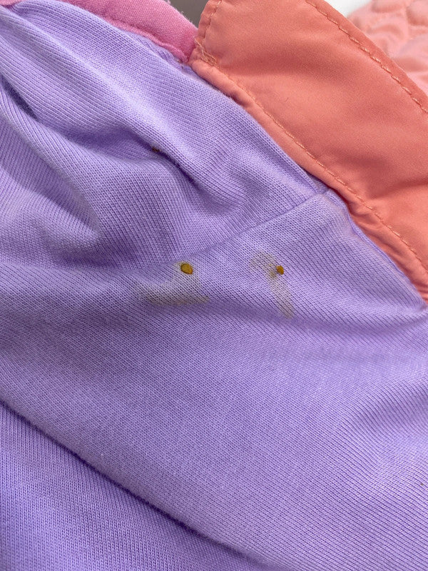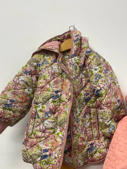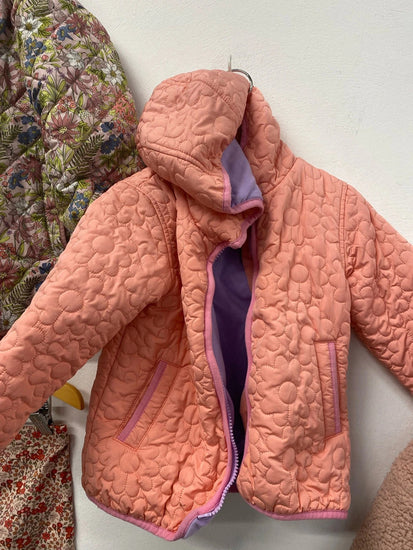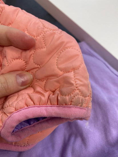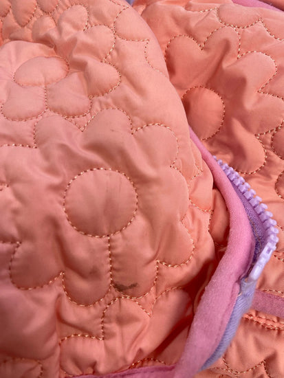 Coral pink floral quilted jacket. Please note there’s a small mark on the front of the jacket, on the sleeves, and in the lining. See photos.