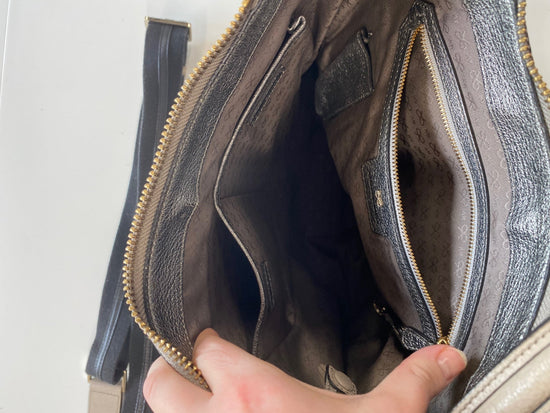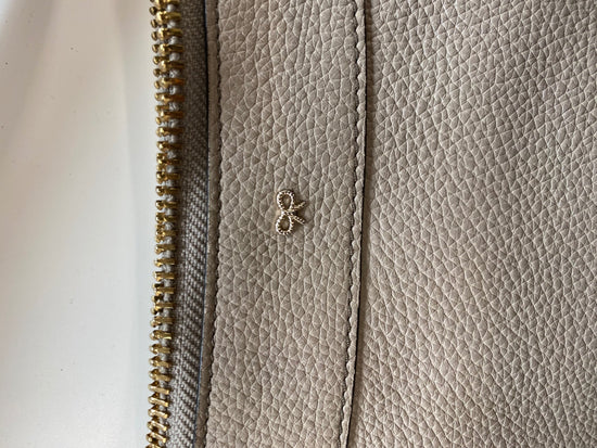 A spacious beige leather handbag with metallic silver accents at the corners. Its sleek design combines elegance with practicality, making it a versatile accessory for day-to-night looks. The subtle gold hardware adds a touch of sophistication, perfect for elevating casual or formal outfits.