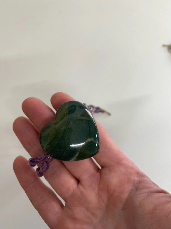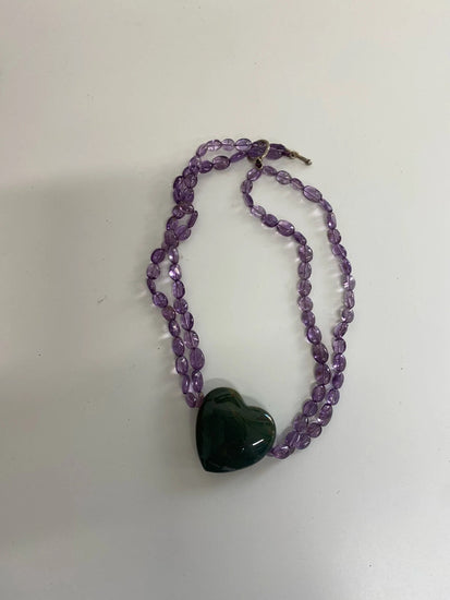 Fabulous green heart & purple beaded necklace silver clasp LB006, brand: Handmade, condition: Good