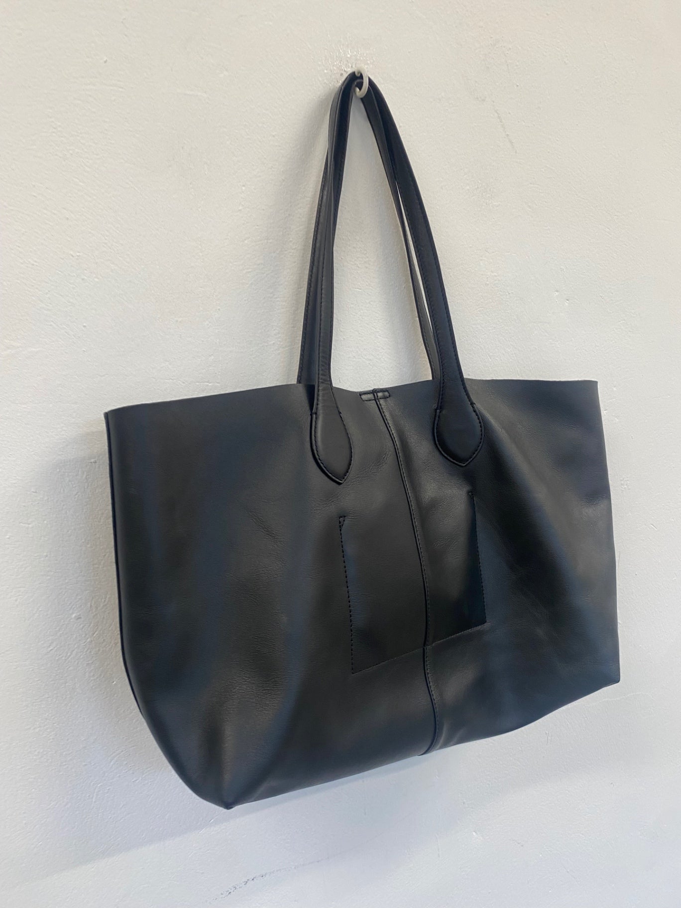 A classic black leather tote bag offers versatile style with its spacious interior and durable material. Perfect for everyday use or travel, it combines functionality with understated elegance. The simple design makes it a timeless accessory suitable for various outfits.