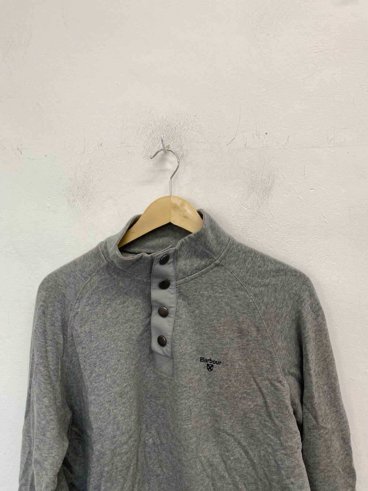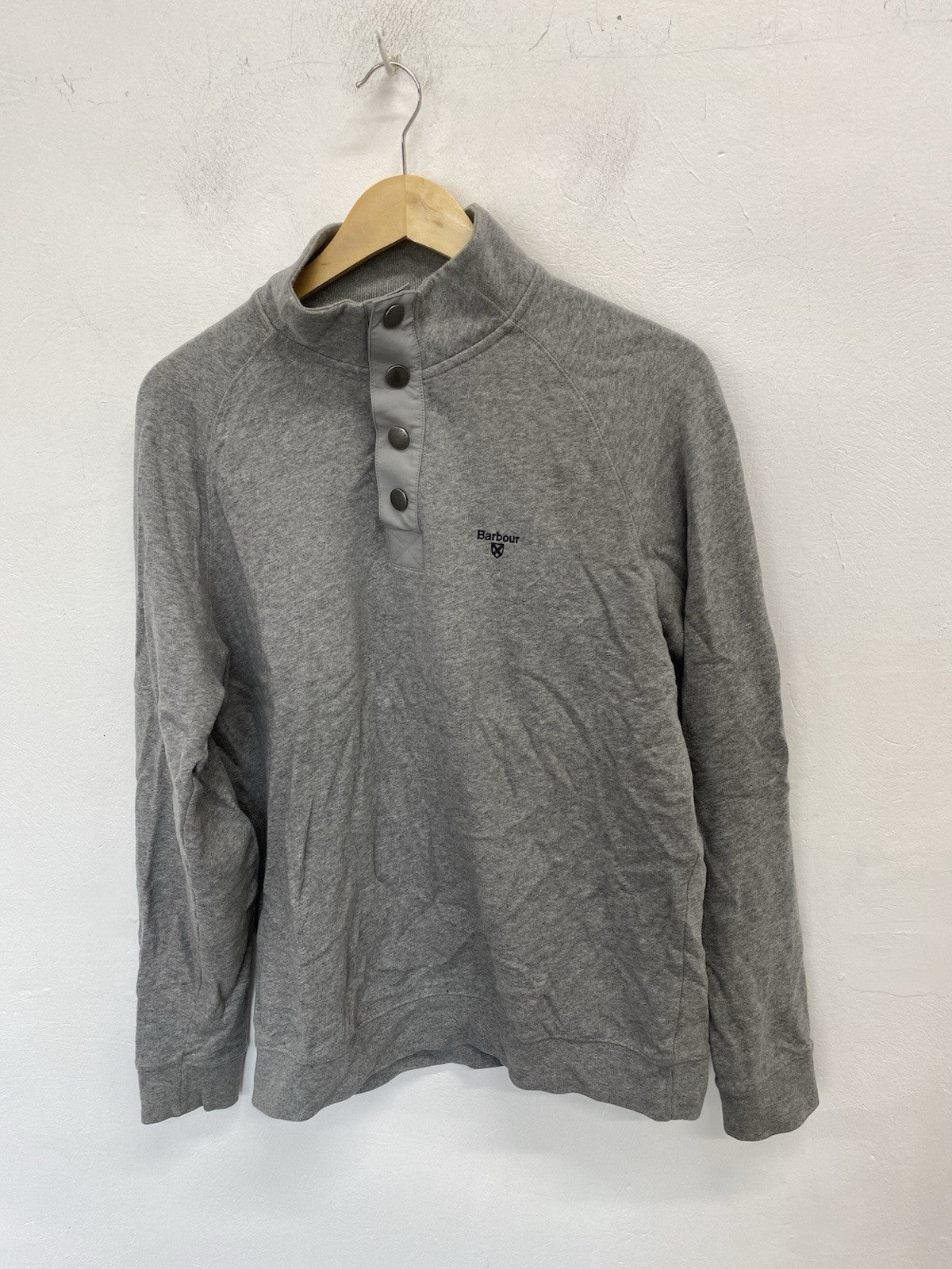 This men's Barbour jumper in size M features a stylish high button neck and a V-neckline, making it suitable for various occasions such as travel, casual wear, and workwear. Made from cotton material, the grey jumper has embroidered accents and a logo, adding a touch of sophistication. With long sleeves and a regular fit, this pullover style is perfect for autumn, winter, and spring seasons, making it a versatile and fashionable addition to any wardrobe.
