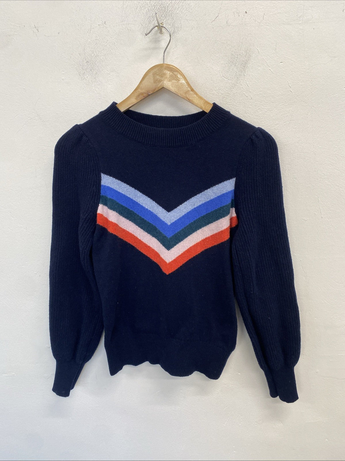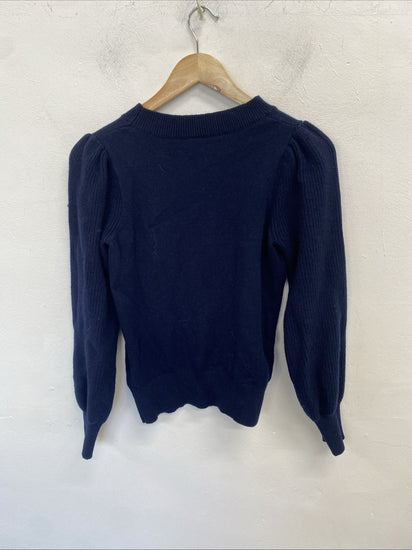 The jumper comes in a UK size XS, with long sleeves suitable for autumnal outings or winter layering. It's machine washable for easy care, meaning you can enjoy its vibrant blue hue and snug fit for seasons to come. The knit fabric offers a comforting feel, perfect for those who appreciate a mix of style and practicality.