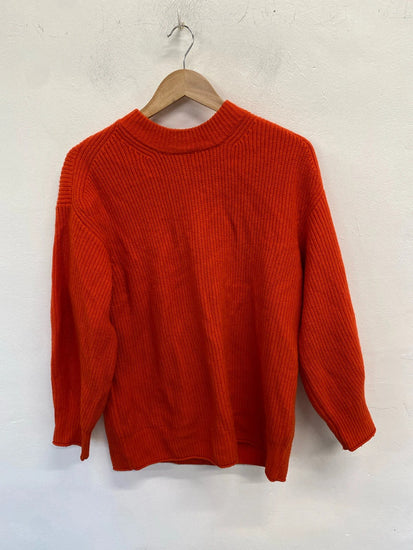 This lovely Jigsaw jumper is crafted from a cashmere blend in a vibrant orange hue. It features a striped pattern, long sleeves, and a crew neck, making it a classic and stylish choice for the winter season. The jumper is a UK size small with a regular fit, suitable for casual occasions. Care instructions recommend hand washing only, and the breathable knit fabric ensures comfort. Perfect for adding a pop of colour to your wardrobe, this pullover from Jigsaw is a versatile and timeless piece.