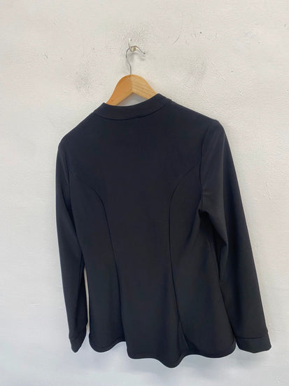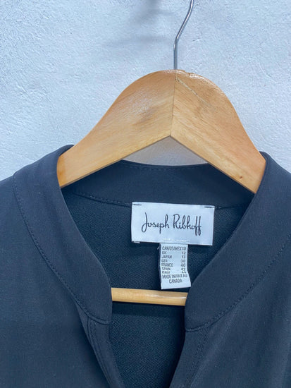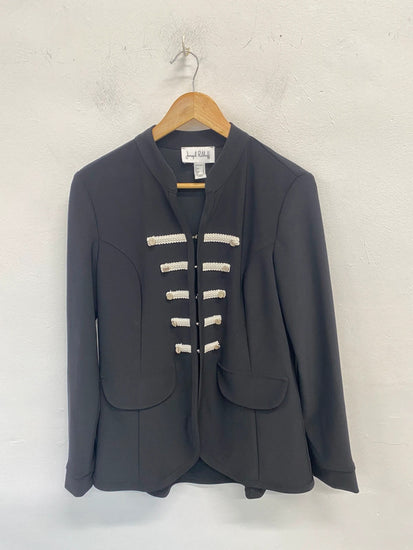 This lovely Joseph Ribkoff jacket in UK size 12 features a black lace fabric with a slim fit and a short length, making it perfect for various occasions such as travel, parties, or formal and business events. The jacket has a hook & eye closure and is lined with polyester, suitable for wearing in autumn, winter, summer, or spring. With a designer brand and a touch of Bohemian, Classic, and 90s style, this military-inspired jacket adds a sophisticated flair to any outfit. Made in Canada, it is a stylish and versatile choice for women's outerwear.