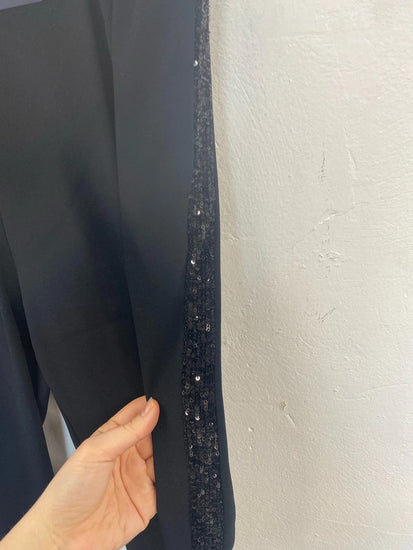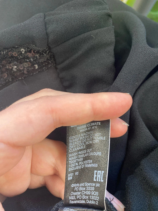 M&S Fabulous Black High Rise Tapered Sequin Trousers UK 12 Short. Add some glitz and glam to your life with these trousers! The perfect garment to help you dazzle at any party or night out. Back pocket is a faux pocket.