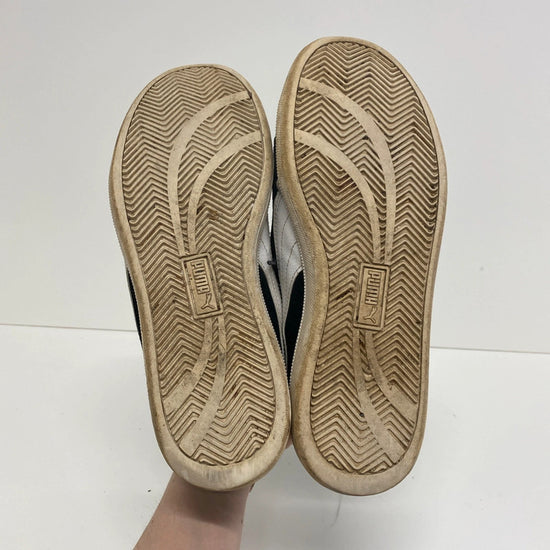 These Puma Men's Black Suede Trainers in UK size 9 feature a low top design with a solid black colour with white tripe and lace-up closure. Made with suede uppers and fabric lining, they are part of the Puma Classic line, offering a timeless style suitable for all seasons. The trainers have a standard shoe width, rubber outsole, and rubber cleats, providing comfort and durability for everyday wear. Perfect for men looking for a stylish and versatile sneaker option.