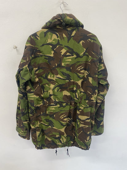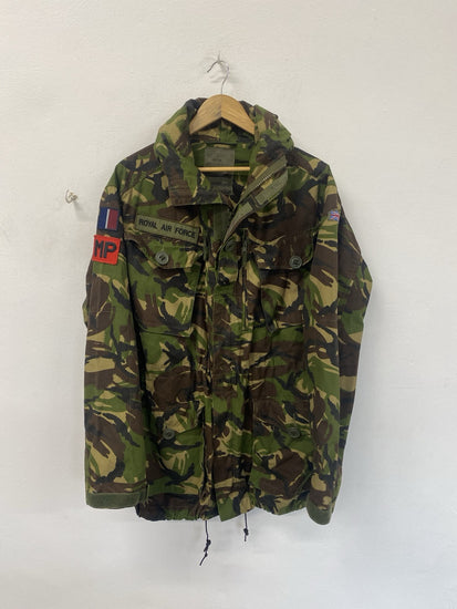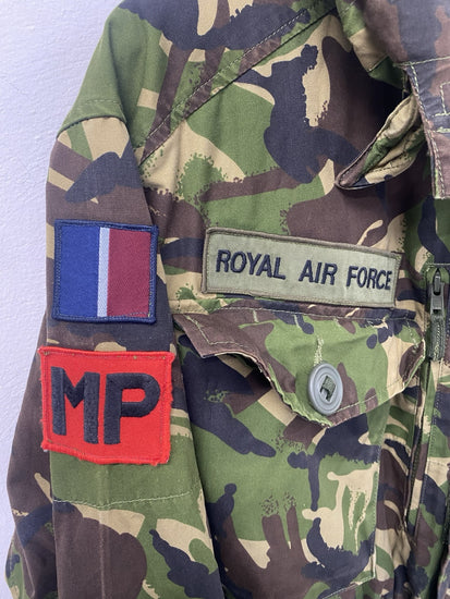 The RAF Issued Jacket Smock in Woodland DPM is a windproof garment issued to the Air Force personnel of NATO member countries, particularly those from the United Kingdom. This jacket, in size 180/104, features MP Military Police and tactical flash patches and is designed for use in outdoor military operations. The jacket's design reflects its utility in providing protection and camouflage in varying terrains and weather conditions, making it a practical and essential piece of militaria for Air Force personnel.