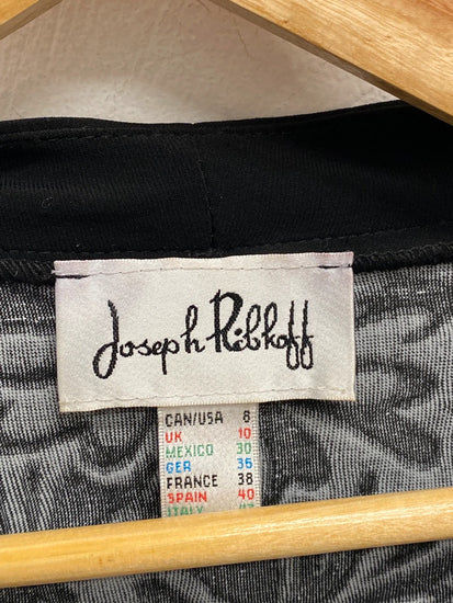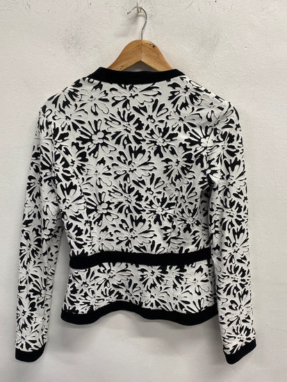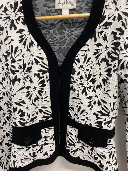 This stunning Joseph Ribkoff blazer jacket in UK size 10 features a stylish black and white floral pattern, perfect for parties, formal events, or business settings. The jacket is designed in a basic style suitable for autumn, winter, and spring seasons. Made by the reputable brand Joseph Ribkoff, this jacket is a fashionable and versatile addition to any woman's wardrobe.